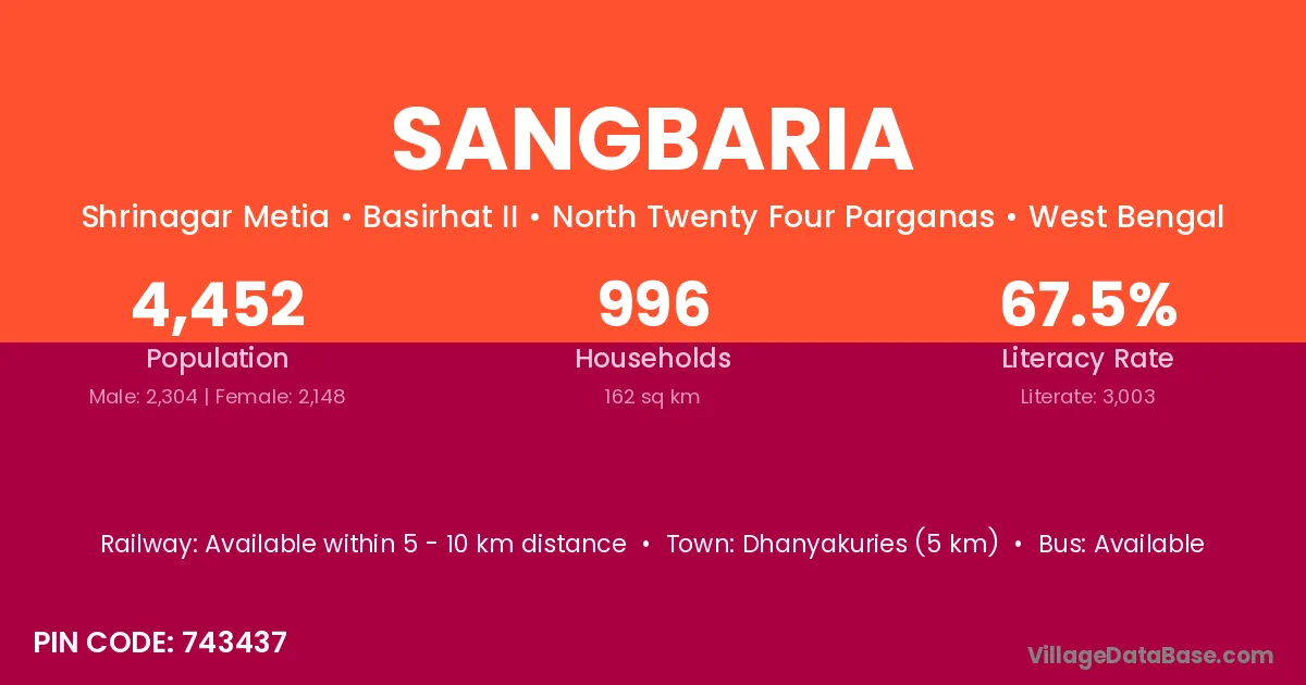 According to Census 2011 information, the village code of Sangbaria village is 822114.