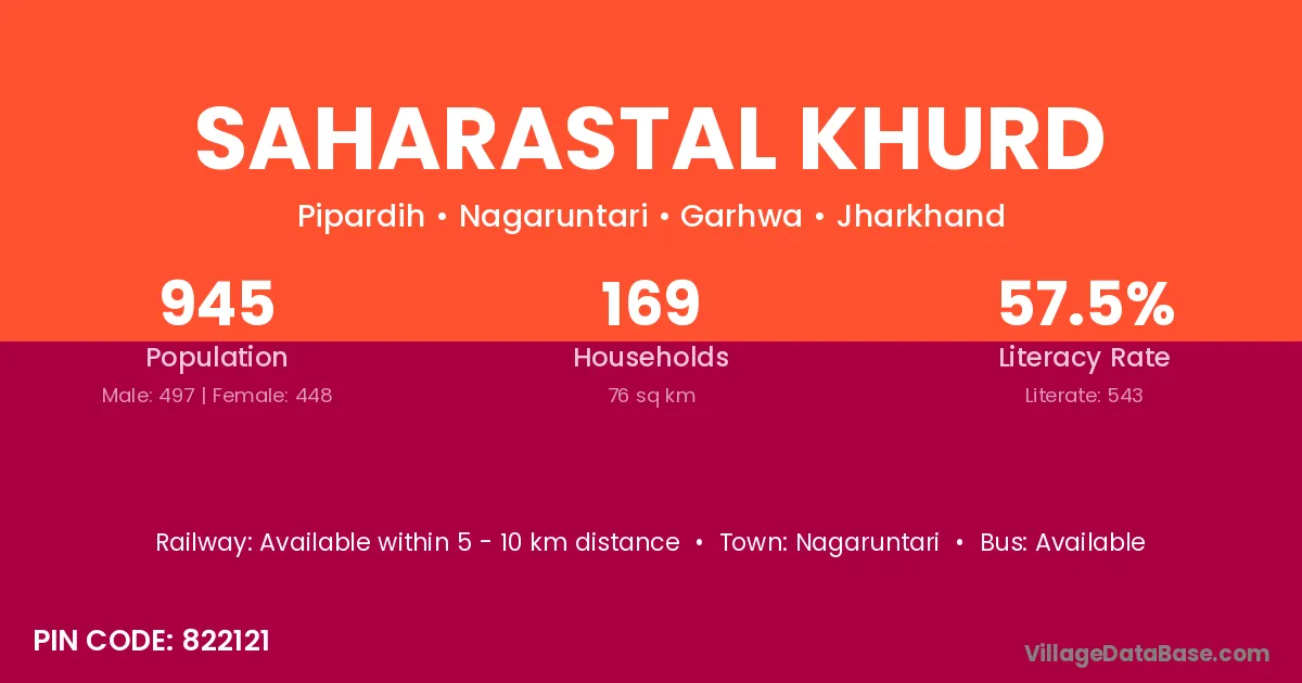 Saharastal Khurd village has a total population of 945 people, of which 497 are males and 448 are females.