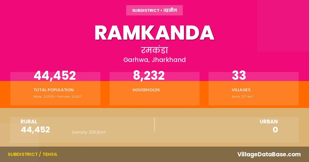 Ramkanda is a town and Subdivision in the Garhwa district of the Jharkhand. In India, a Subdivision is a subdivision of a district responsible for the administration and revenue collection of a specific area within the district. Subdivisions play a crucial role in the local governance structure, contributing significantly to the development and administration of their communities.