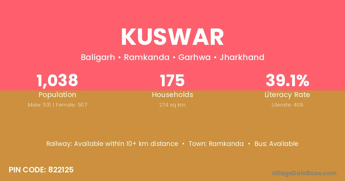 Kuswar village has a total population of 1,038 people, of which 531 are males and 507 are females.