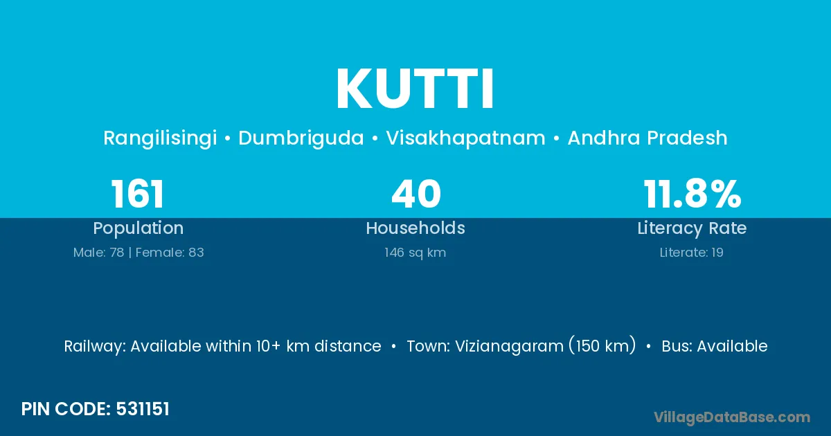 The literacy rate of Kutti village is 43.42%. Male literacy stands at 51.76% and female literacy at 35.33%.