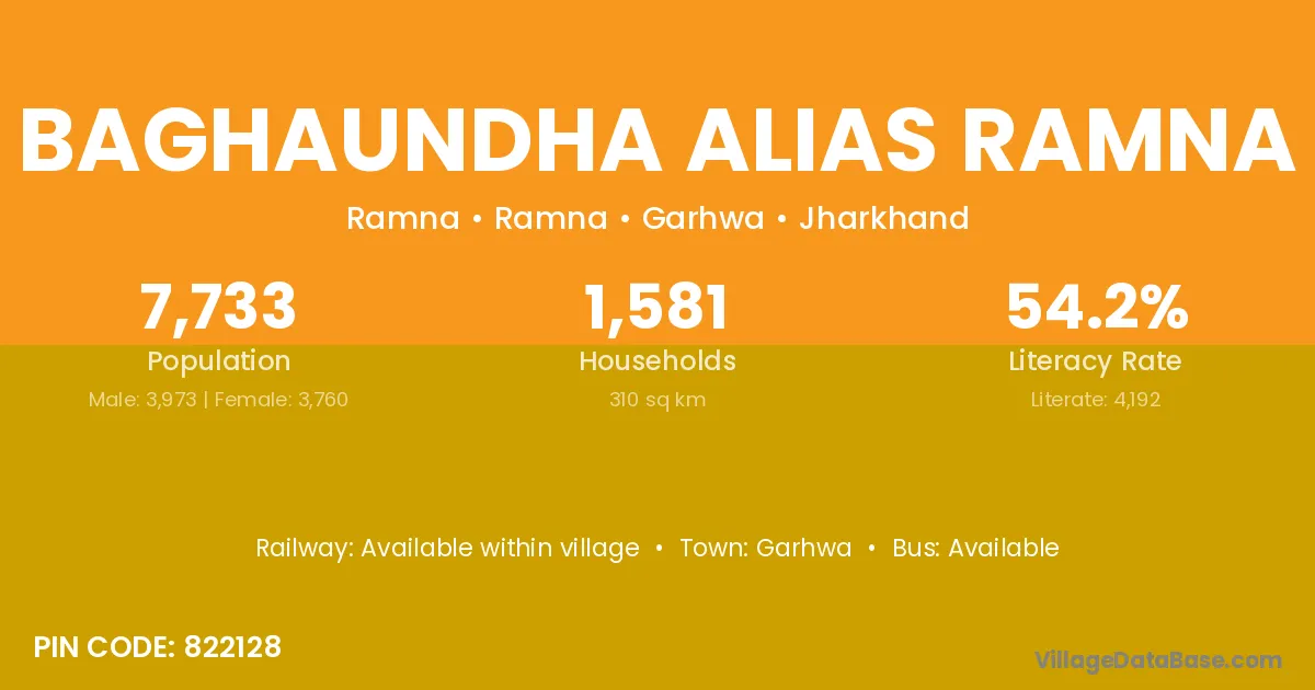 Baghaundha Alias Ramna village has a total population of 7,733 people, of which 3,973 are males and 3,760 are females.