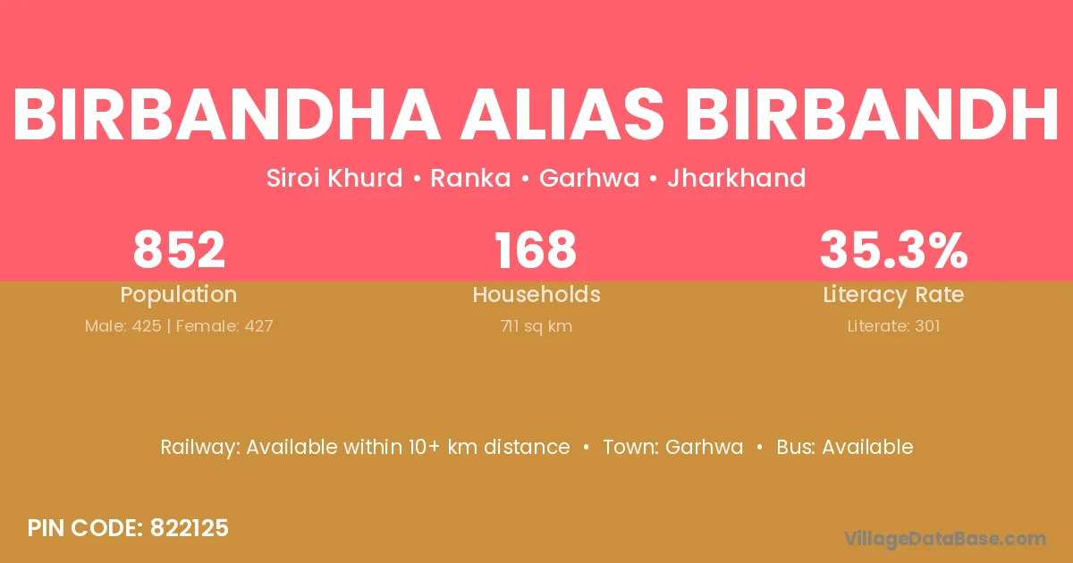Birbandha Alias Birbandh village has a total population of 852 people, of which 425 are males and 427 are females.