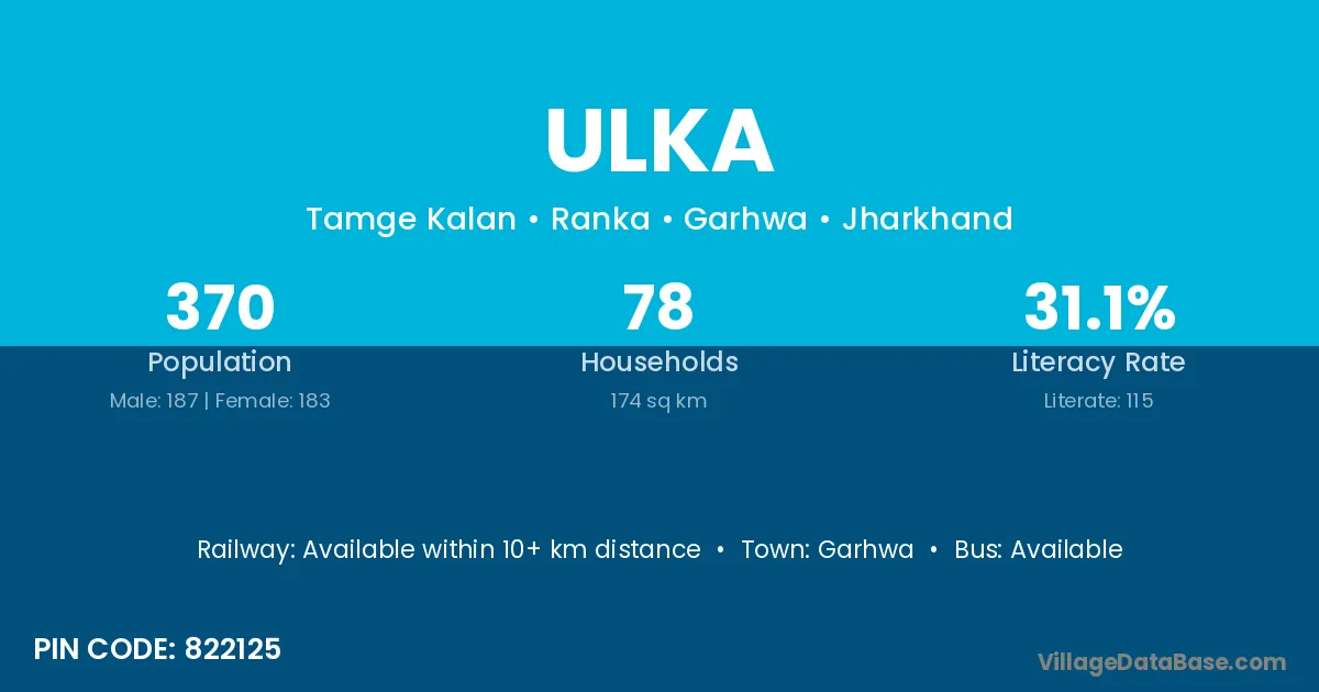 Ulka village has a total population of 370 people, of which 187 are males and 183 are females.