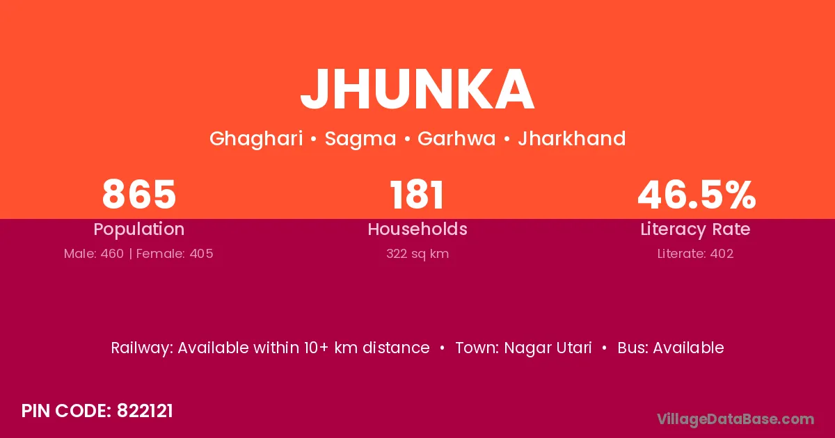 Jhunka village has a total population of 865 people, of which 460 are males and 405 are females.