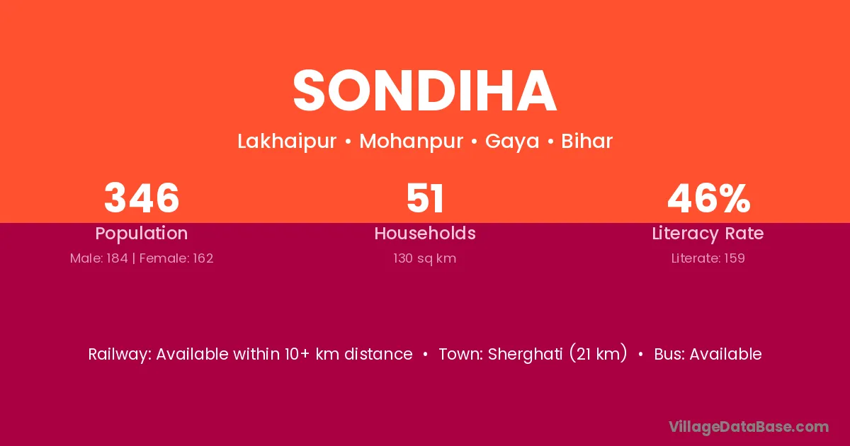 The literacy rate of Sondiha village is 48.22%. Male literacy stands at 61.45% and female literacy at 33.56%.