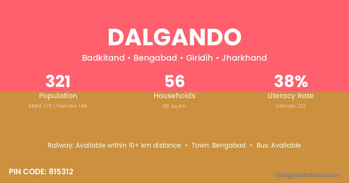 The literacy rate of Dalgando village is 38.01%. Male literacy stands at 44.57% and female literacy at 30.14%.