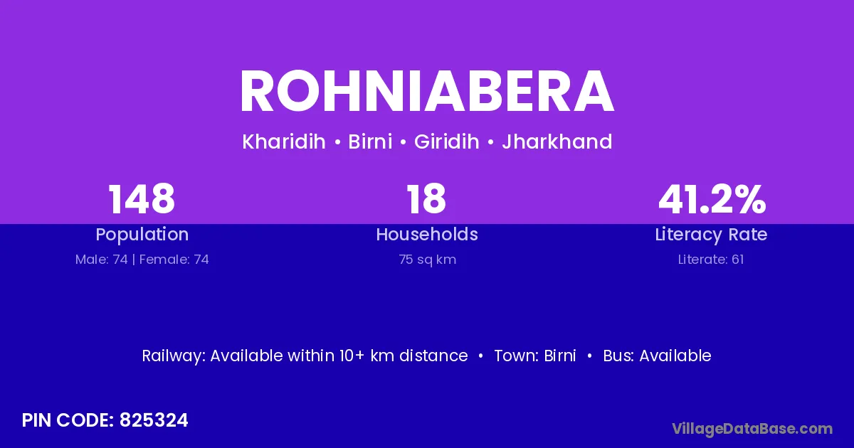 Rohniabera village has a total population of 148 people, of which 74 are males and 74 are females.