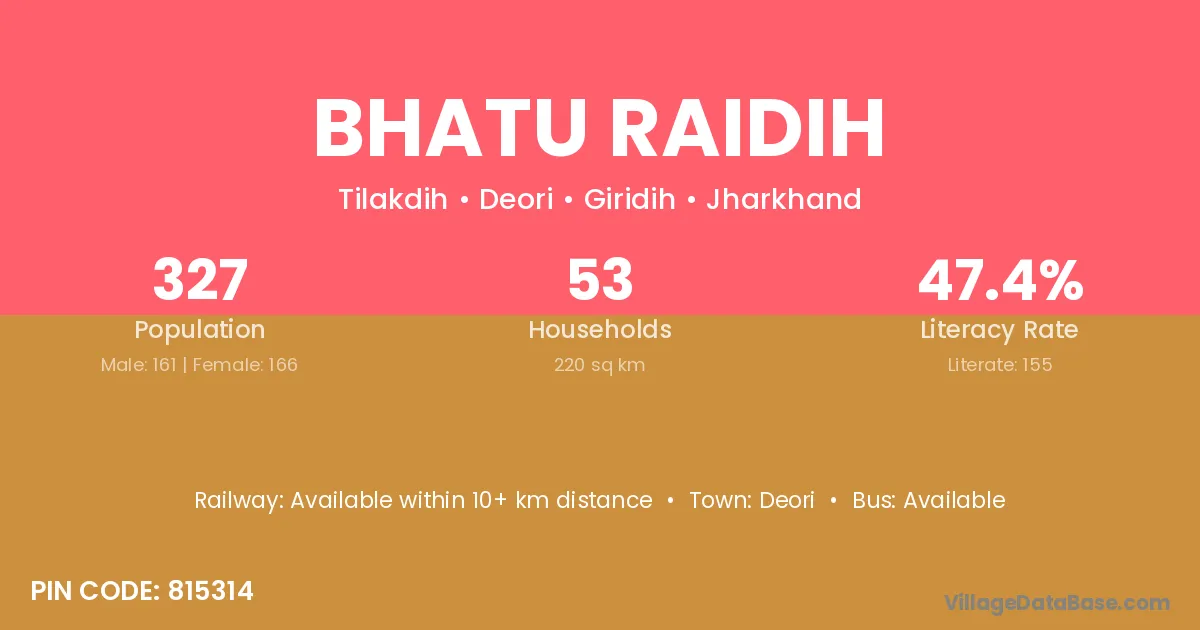 Bhatu Raidih village has a total population of 327 people, of which 161 are males and 166 are females.