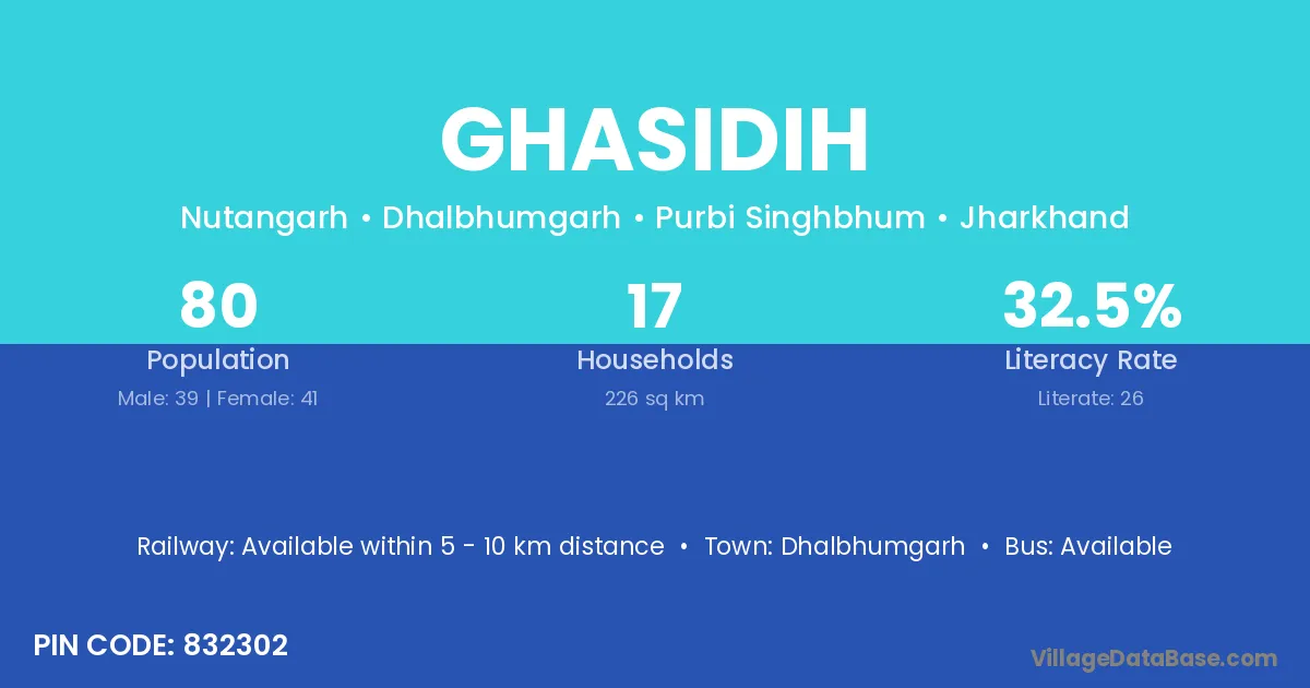 The literacy rate of Ghasidih village is 65.98%. Male literacy stands at 72.09% and female literacy at 61.11%.