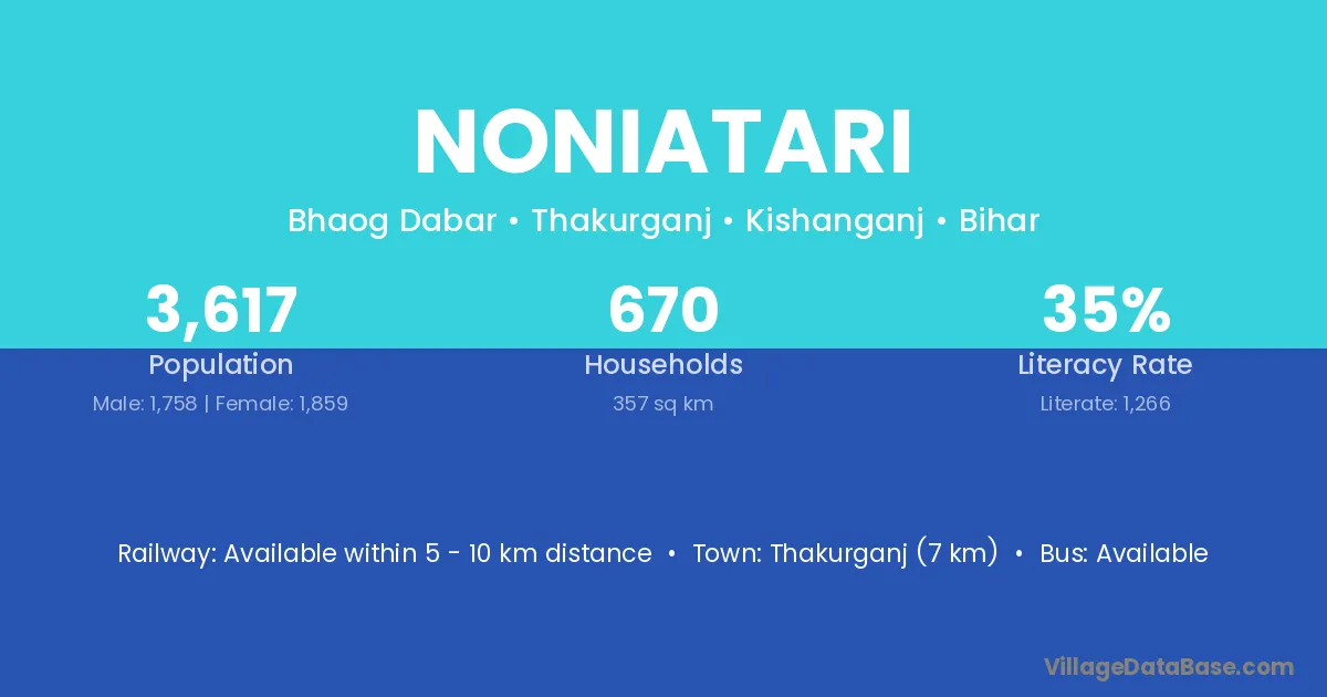 The literacy rate of Noniatari village is 58.85%. Male literacy stands at 74.63% and female literacy at 42.06%.