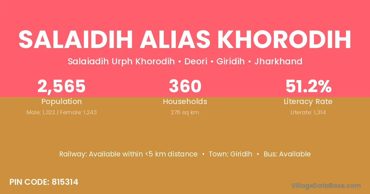 Salaidih Alias Khorodih village has a total population of 2,565 people, of which 1,322 are males and 1,243 are females.
