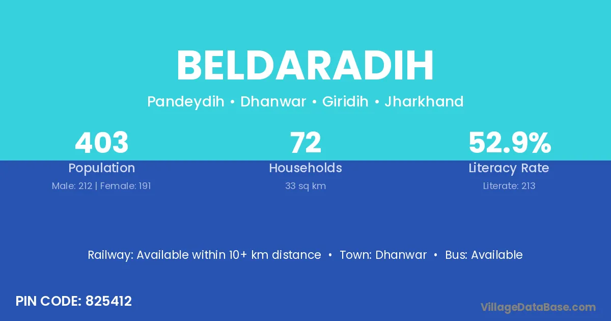 Beldaradih village has a total population of 403 people, of which 212 are males and 191 are females.