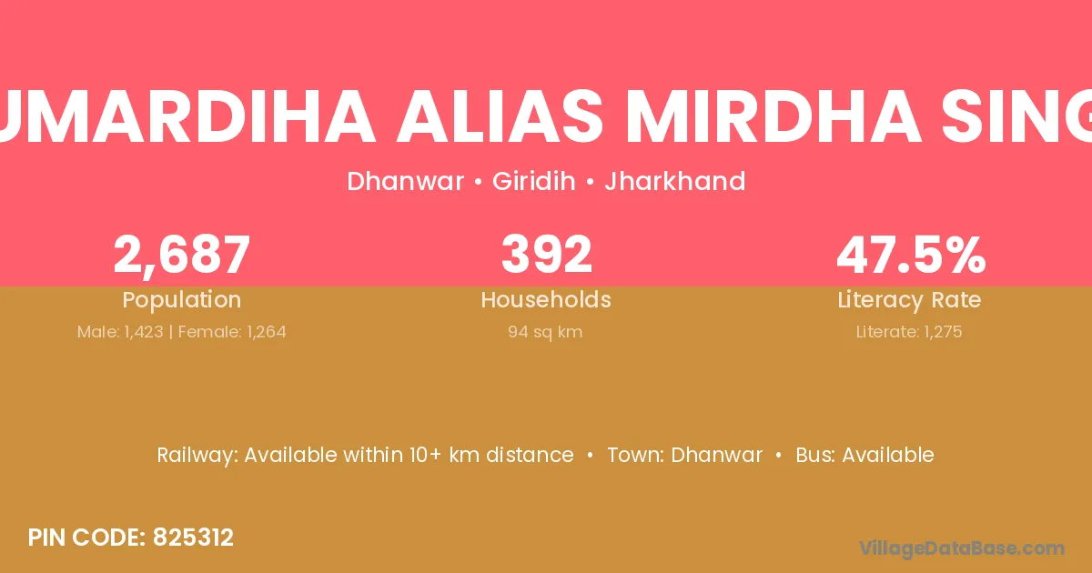 Dumardiha Alias Mirdha Singh village has a total population of 2,687 people, of which 1,423 are males and 1,264 are females.