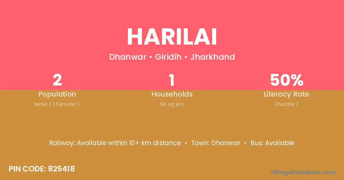 The literacy rate of Harilai village is 50.00%. Male literacy stands at 100.00% and female literacy at 0.00%.