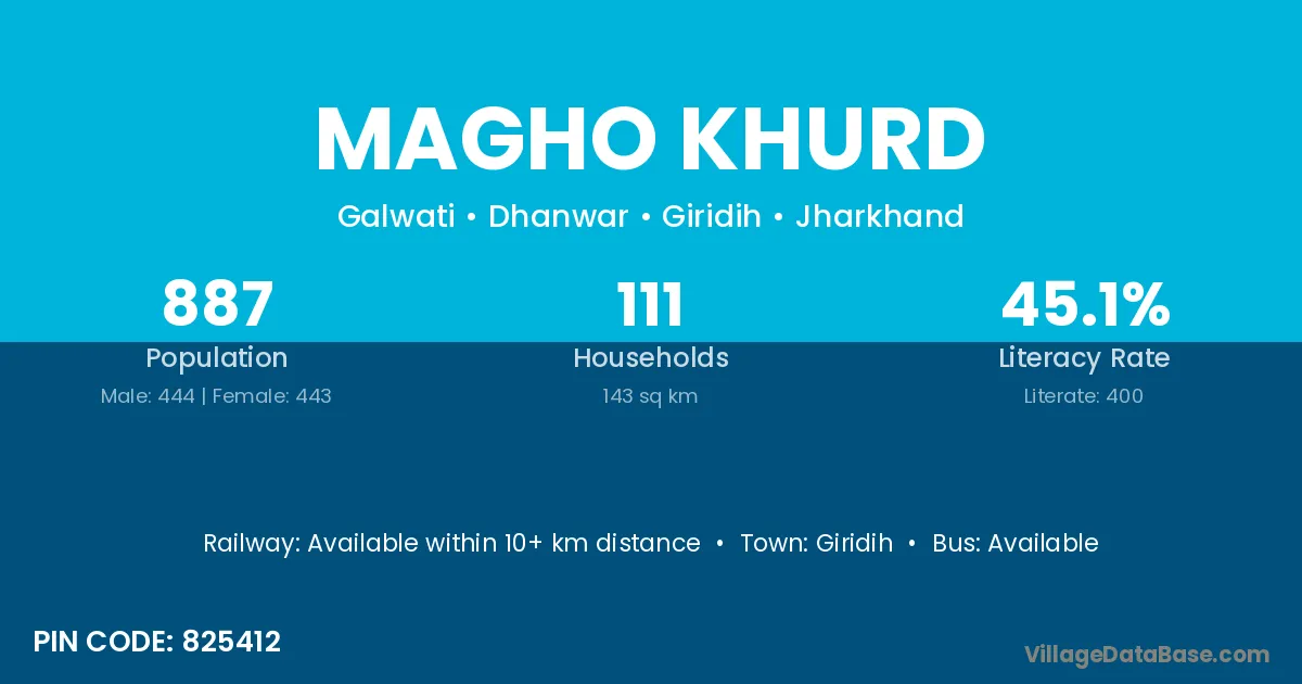Magho Khurd village has a total population of 887 people, of which 444 are males and 443 are females.