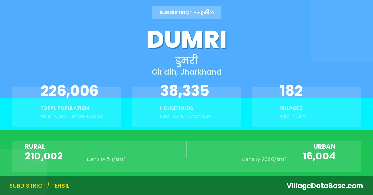 According to the 2011 census The total area of Dumri Subdivision is 418 km², with a population of 226006 people. The population density is 540 inhabitants per square kilometre, and there are approximately 38335 houses in the sub district.