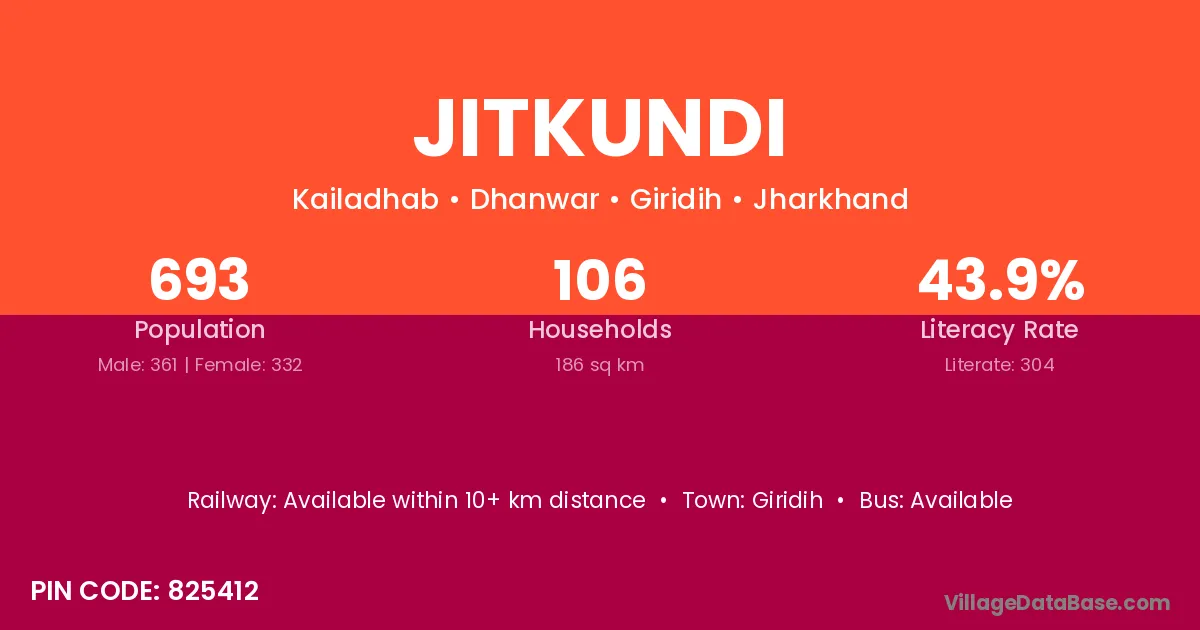 The literacy rate of Jitkundi village is 54.13%. Male literacy stands at 68.61% and female literacy at 38.15%.