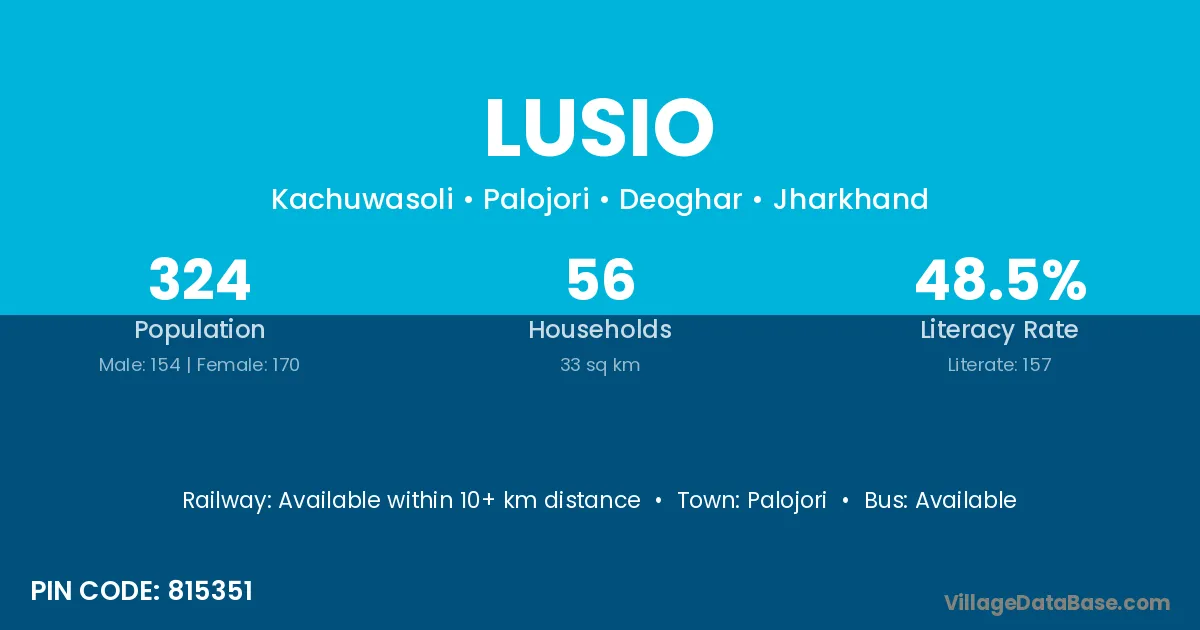 The literacy rate of Lusio village is 20.16%. Male literacy stands at 28.42% and female literacy at 11.76%.