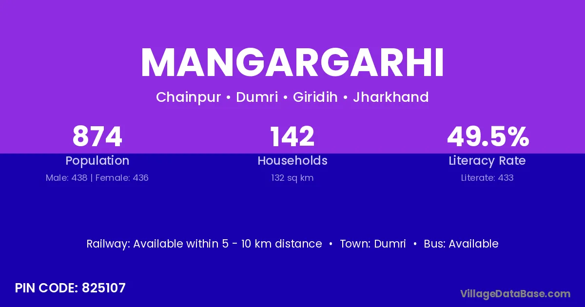 Mangargarhi village has a total population of 874 people, of which 438 are males and 436 are females.