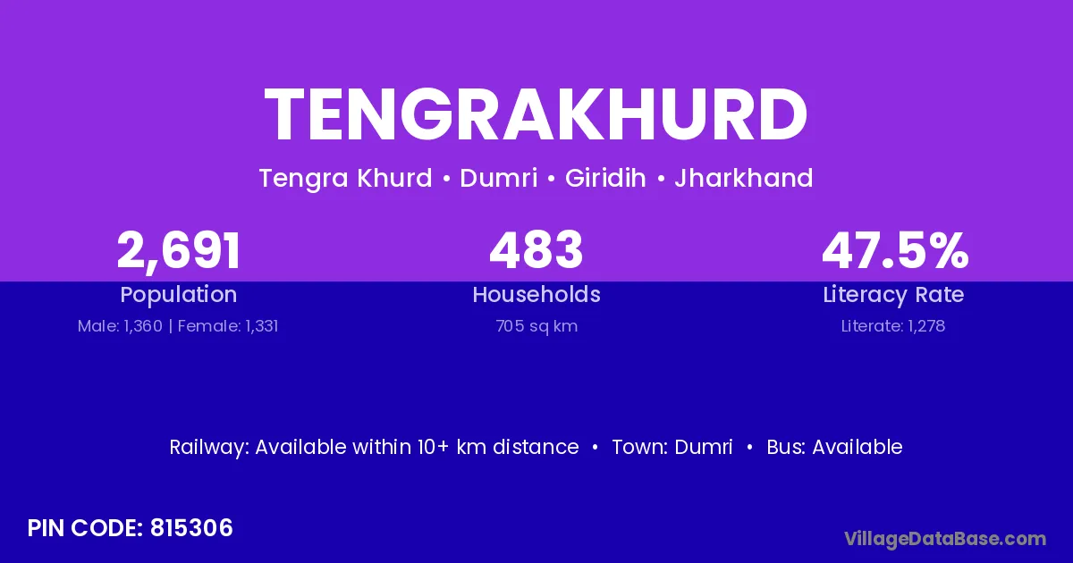 Tengrakhurd village has a total population of 2,691 people, of which 1,360 are males and 1,331 are females.