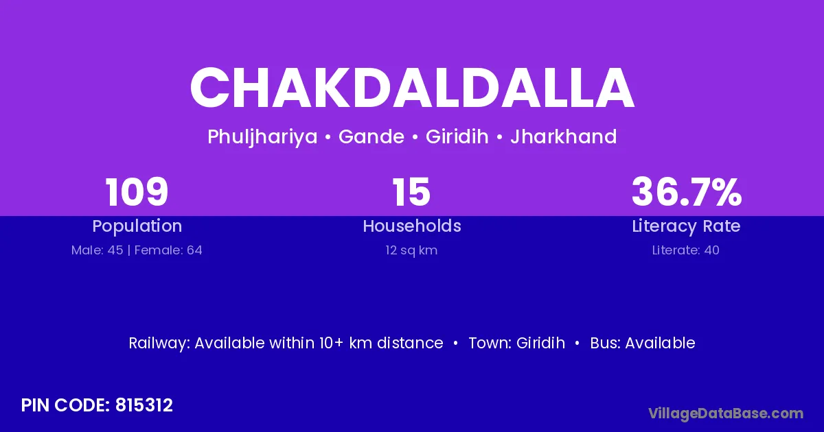 Chakdaldalla village has a total population of 109 people, of which 45 are males and 64 are females.