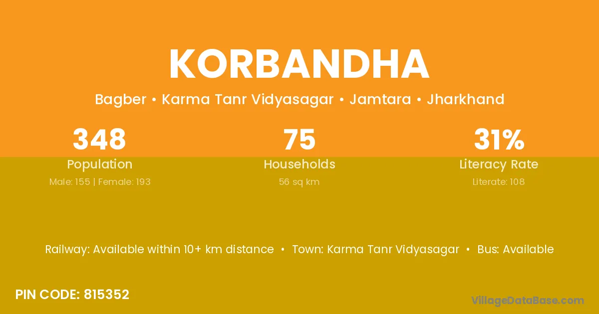 The literacy rate of Korbandha village is 42.18%. Male literacy stands at 53.25% and female literacy at 31.01%.