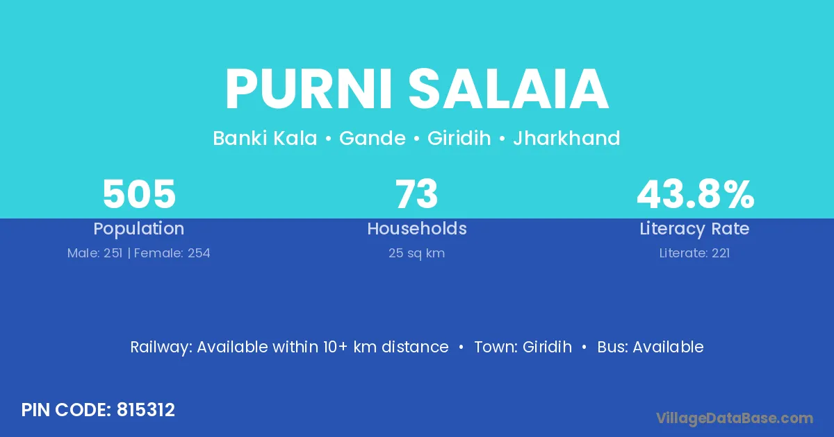 Purni Salaia village has a total population of 505 people, of which 251 are males and 254 are females.