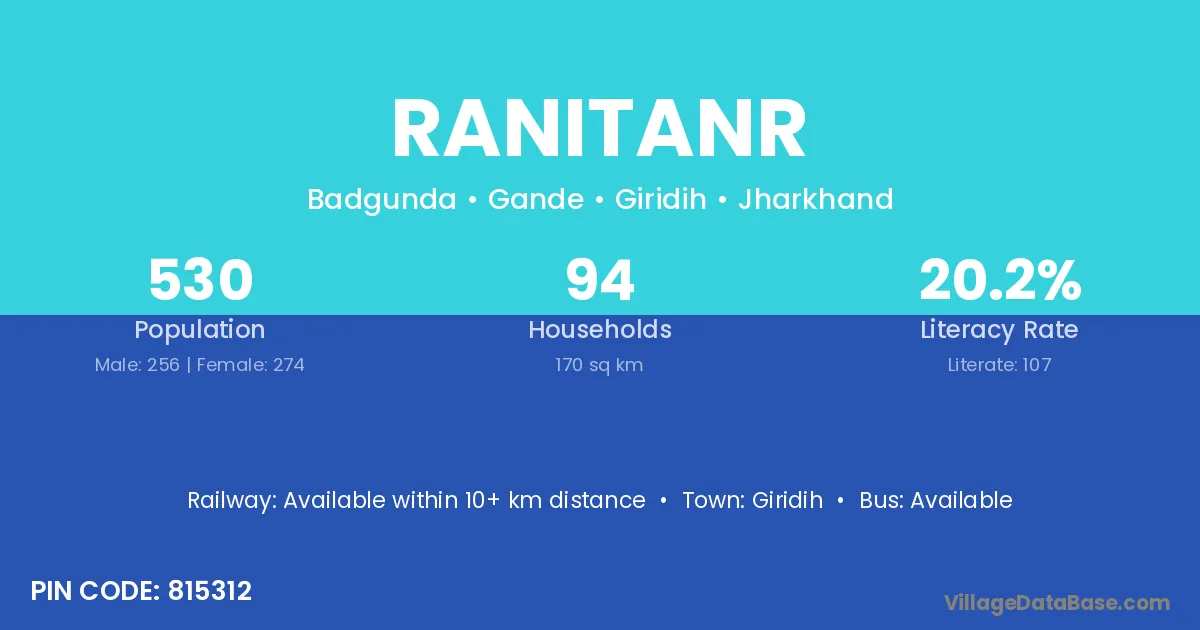 Ranitanr village has a total population of 530 people, of which 256 are males and 274 are females.