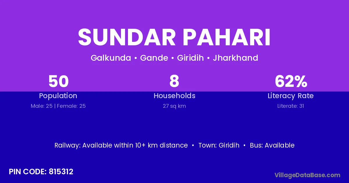Sundar Pahari village has a total population of 50 people, of which 25 are males and 25 are females.