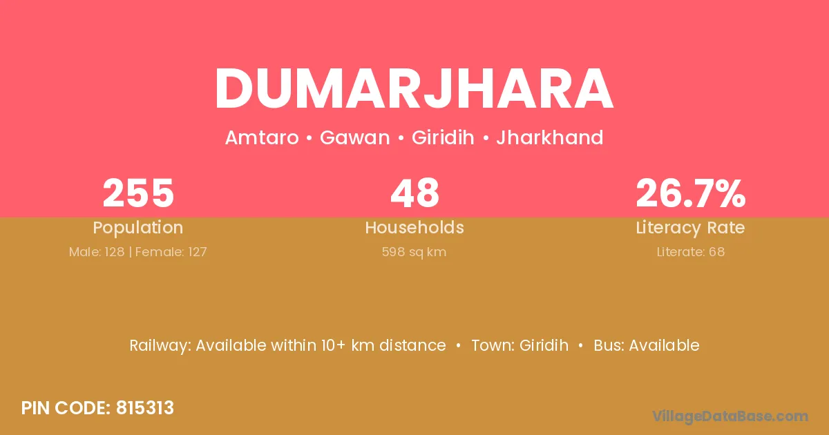 Dumarjhara village has a total population of 255 people, of which 128 are males and 127 are females.