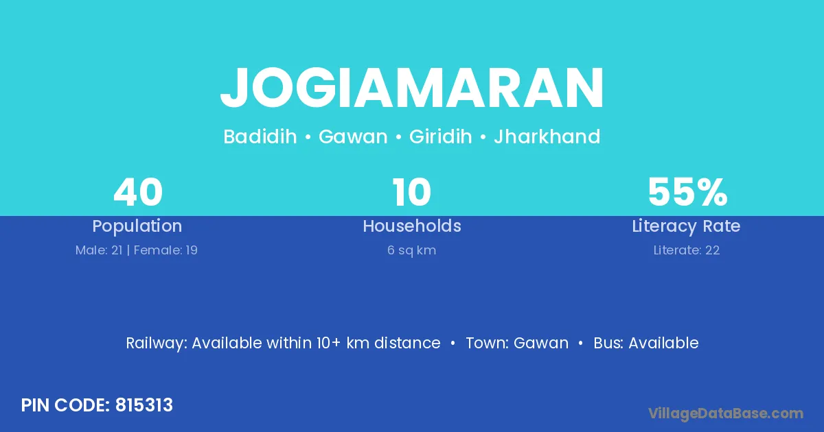 The literacy rate of Jogiamaran village is 55.00%. Male literacy stands at 71.43% and female literacy at 36.84%.