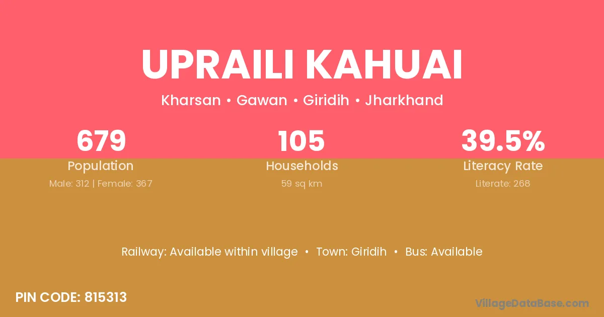 Upraili Kahuai village has a total population of 679 people, of which 312 are males and 367 are females.