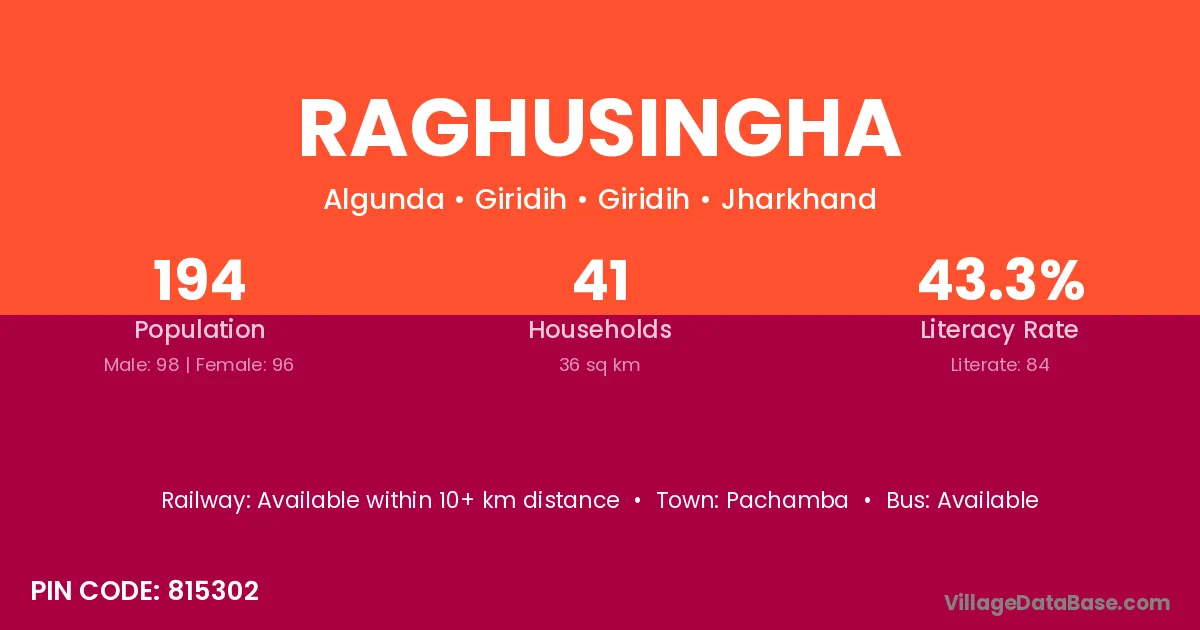 Raghusingha village has a total population of 194 people, of which 98 are males and 96 are females.
