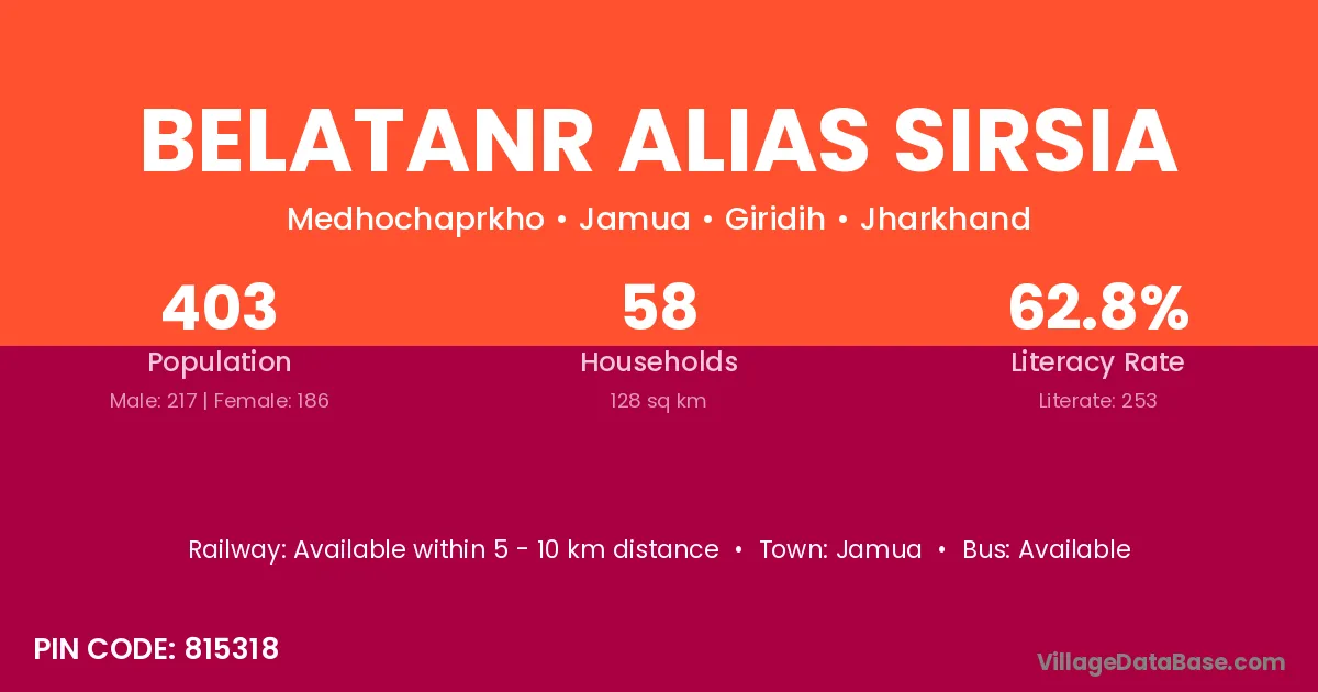 Belatanr Alias Sirsia village has a total population of 403 people, of which 217 are males and 186 are females.