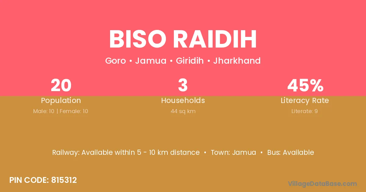 Jamua is the nearest town to Biso Raidih village for major economic activities