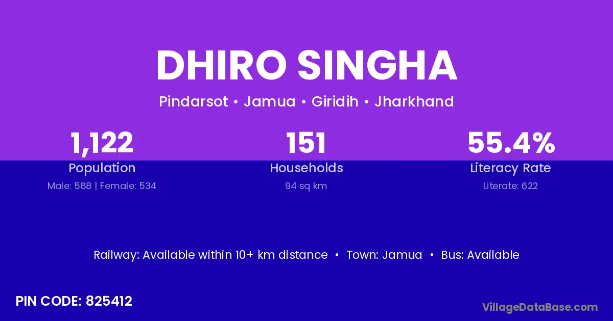 Dhiro Singha village has a total population of 1,122 people, of which 588 are males and 534 are females.