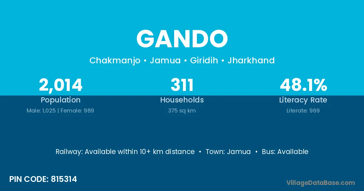 The literacy rate of Gando village is 48.11%. Male literacy stands at 60.29% and female literacy at 35.49%.