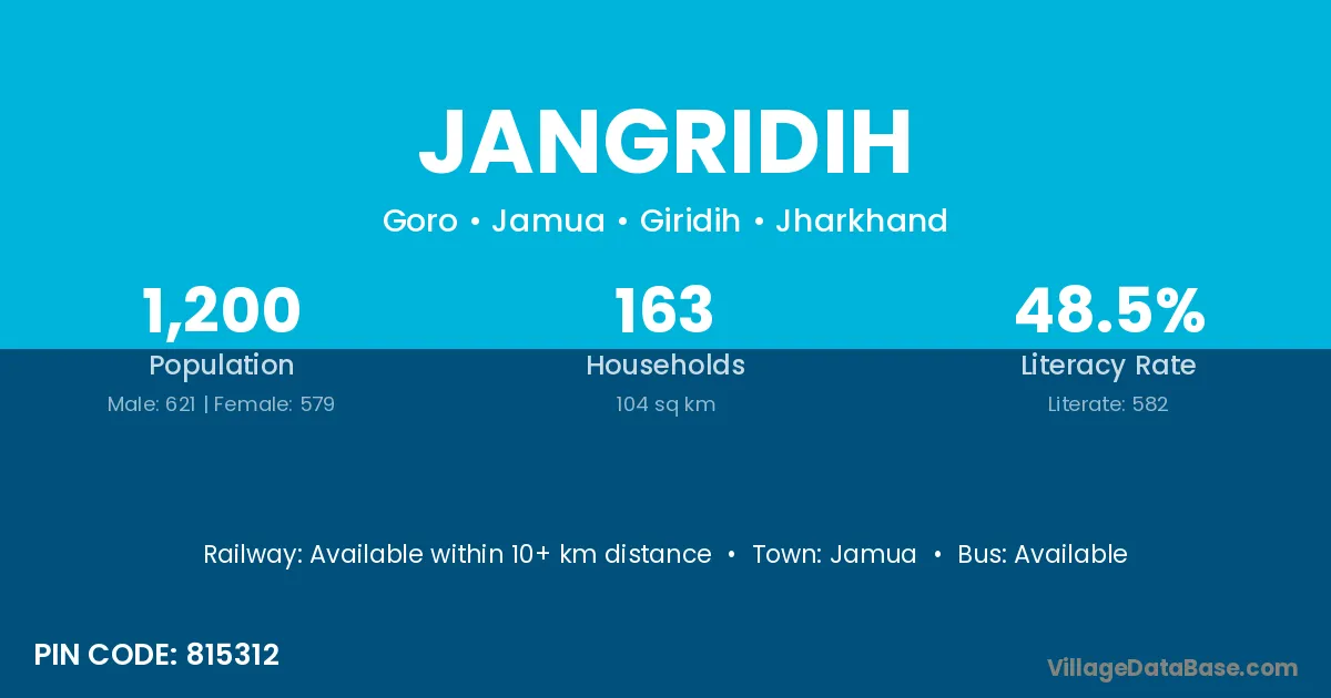 Jangridih village has a total population of 1,200 people, of which 621 are males and 579 are females.