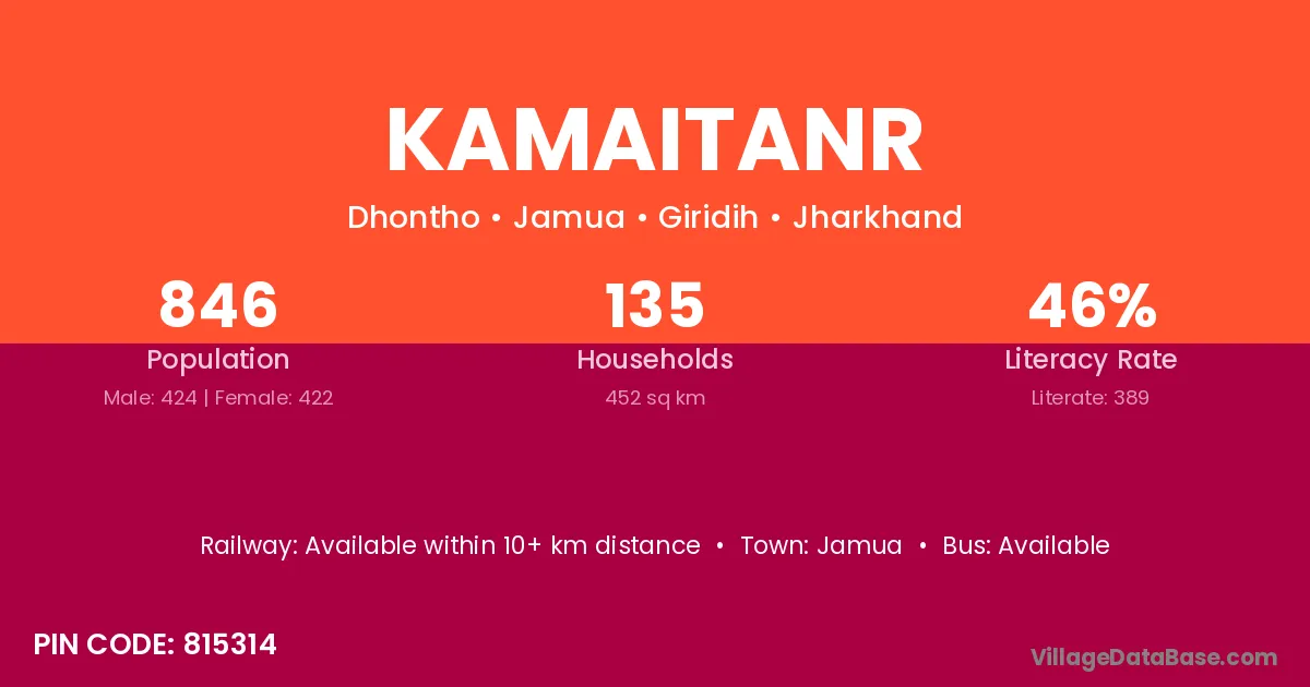 Kamaitanr village has a total population of 846 people, of which 424 are males and 422 are females.