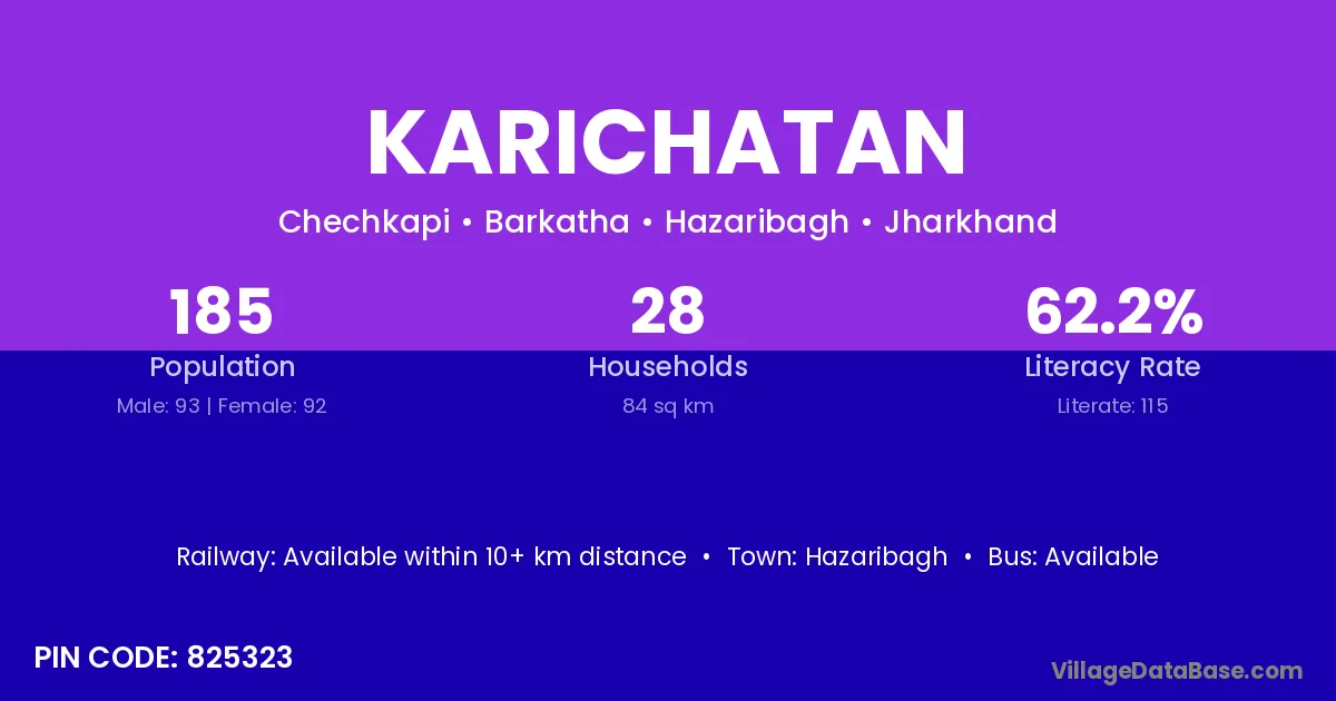 The literacy rate of Karichatan village is 42.24%. Male literacy stands at 55.05% and female literacy at 29.23%.