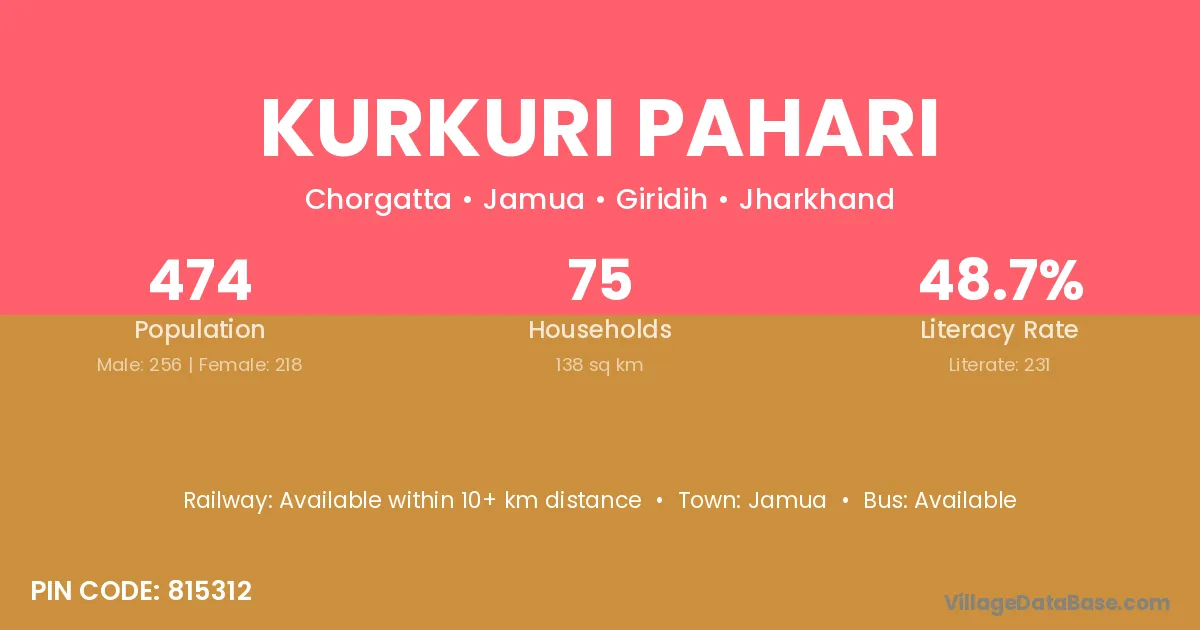 Kurkuri Pahari village has a total population of 474 people, of which 256 are males and 218 are females.