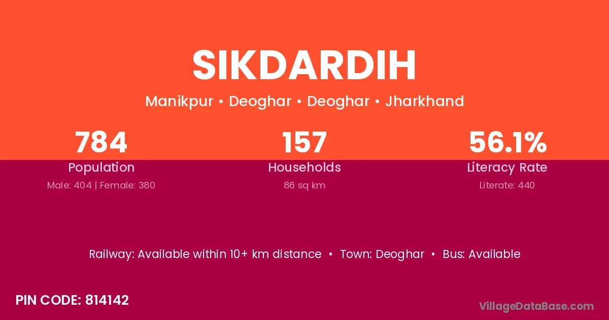 Sikdardih village has a total population of 380 people, of which 195 are males and 185 are females.