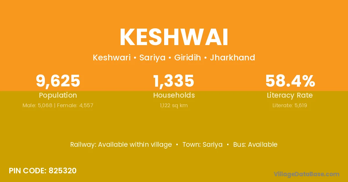Keshwai village has a total population of 9,625 people, of which 5,068 are males and 4,557 are females.