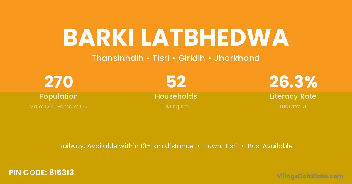 Barki Latbhedwa village has a total population of 270 people, of which 133 are males and 137 are females.