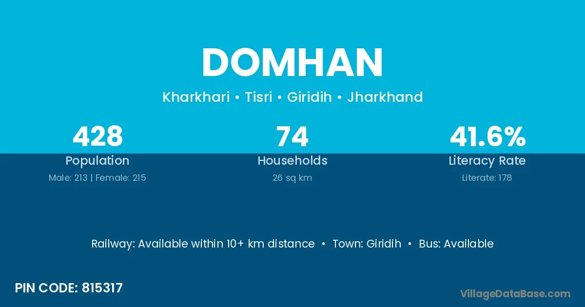 The literacy rate of Domhan village is 41.59%. Male literacy stands at 53.52% and female literacy at 29.77%.