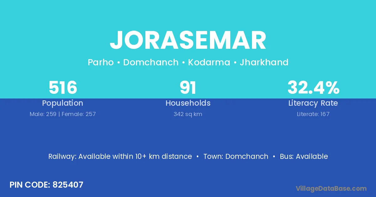 The literacy rate of Jorasemar village is 36.25%. Male literacy stands at 52.65% and female literacy at 19.49%.