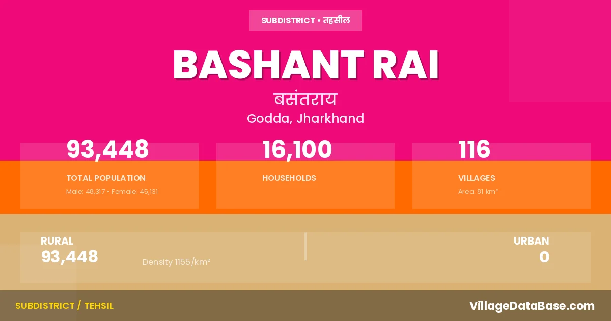 Bashant Rai is a town and Subdivision in the Godda district of the Jharkhand. In India, a Subdivision is a subdivision of a district responsible for the administration and revenue collection of a specific area within the district. Subdivisions play a crucial role in the local governance structure, contributing significantly to the development and administration of their communities.
