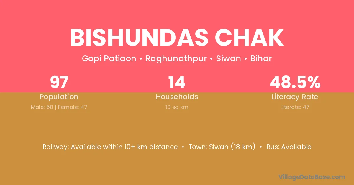 Bishundas Chak village has a total population of 1,345 people, of which 693 are males and 652 are females.