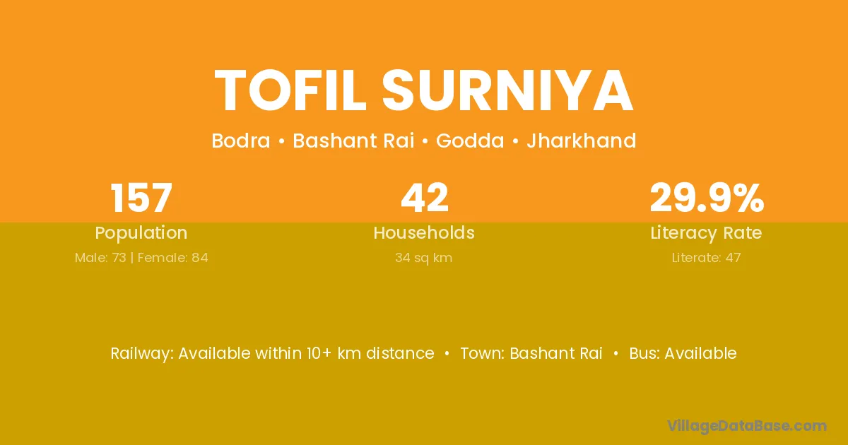 Tofil Surniya village has a total population of 157 people, of which 73 are males and 84 are females.
